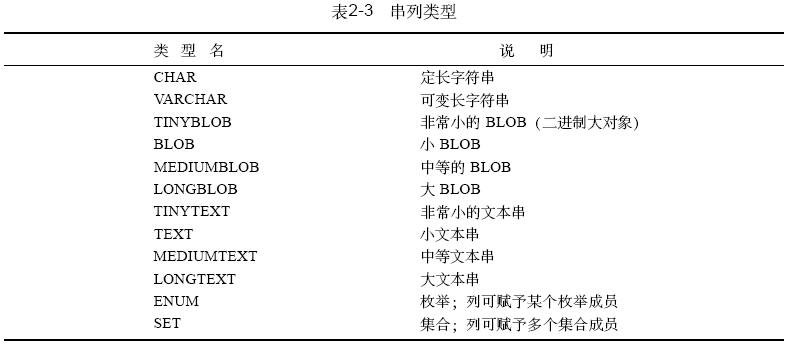 mysql串列類型如表2 - 3所示。串可以存放任何內容,即使是像圖像或聲音這樣的絕對二進制數據也可以存放。串在進行比較時可以設定是否區分大小寫。此外,可對串進行模式匹配(實際上,在mysql中可以在任意列類型上進行模式匹配,但最經常進行模式匹配還是在串類型上)