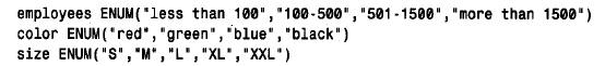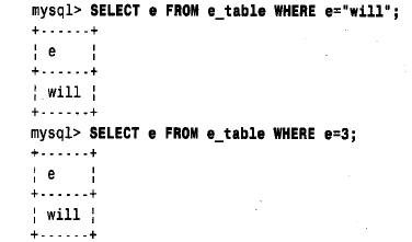 enum 和set 是一種特殊的串類型,其列值必須從一個固定的串集中選擇。它們之間的主要差別是enum 列值必須確實是值集中的一個成員,而set 列值可以包括集合中任意或所有的成員。換句話說, enum 用于互相排斥的值,而s e t列可以從一個值的列表中選擇多個值。
