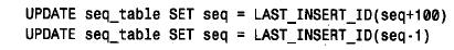 上面的語句創建了表seq_table 并用包含seq 值0 的行對其進行初始化。可利用這個表產生下一個序列號,如下所示: