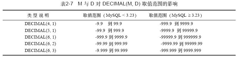 decimal 類型不同于float和decimal,其中decimal 實際是以串存放的。decimal 可能的最大取值范圍與double 一樣,但是其有效的取值范圍由m 和d 的值決定。如果改變m 而固定d,則其取值范圍將隨m 的變大而變大。表2 - 7的前三行說明了這一點。如果固定m 而改變d,則其取值范圍將隨d 的變大而變小(但精度增加)。表2 - 7的后三行說明了這一點。