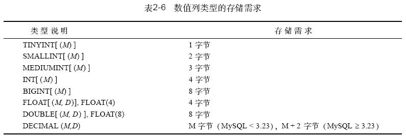 以賦予浮點列,這時將它們表示為小數部分為零的浮點值。每種數值類型的名稱和取值范圍如表2 - 5所示。各種類型值所需的存儲量如表2-6 所示。