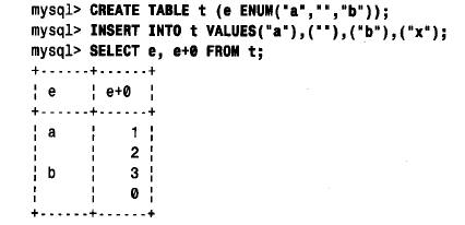 列定義中的enum 成員是從1開始順序編號的。(0 被mysql用作錯誤成員,如果以串的形式表示就是空串。)枚舉值的數目決定了enum 列的存儲大小。一個字節可表示256 個值,兩個字節可表示65 536 個值。(可將其與一字節和兩字節的整數類型t i n y i n t、