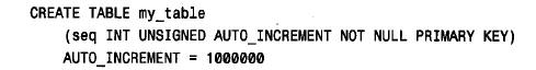 ■ 在創建表時,可以明確指定初始的序列編號。下面的例子創建一個auto _ i n c r e -ment 列seq 從1,000,000 開始的表: