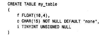 要創建一個表,應使用create table 語句并指定構成表列的列表。每個列都有一個名字和類型,以及與每個類型相關的各種屬性。下面是創建具有三個分別名為f、c 和i 的列的表my_table 的例子: