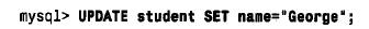 updatet b l_name set 要更改的列where 要更新的記錄這里的where 子句正如delete 語句一樣,是可選的,因此如果不指定的話,表中的每個記錄都被更新。下面的查詢將每個學生的名字都更改為“ g e o rg e”: