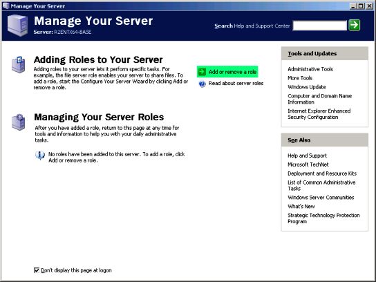 要在系統(tǒng)上安裝application server角色,點(diǎn)擊“開(kāi)始菜單”,選擇“管理服務(wù)器”。在管理服務(wù)器主窗口中,點(diǎn)擊“添加或刪除一個(gè)角色”選項(xiàng)。(圖a)