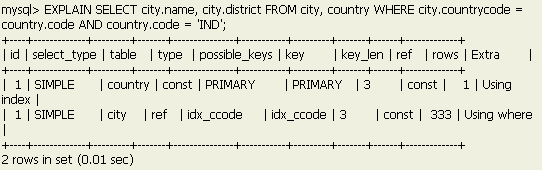 這里查詢是基于兩個表連接。EXPLAIN關鍵字描述了MySQL是如何處理連接這兩個表。必須清楚的是,當前設計要求MySQL處理的是country表中的一條記錄以及city表中的整個4019條記錄。這就意味著,還可使用其他的優化技巧改進其查詢方法。例如,給city表添加如下索引(列表D):