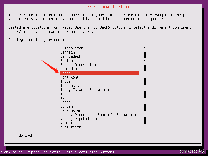 1.4 選擇地區(qū),這里先選擇最后一項other,然后回車再選擇Asia,最后選擇China