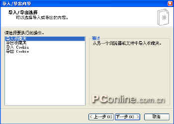 點擊“下一步”后進入如圖2所示的頁面。在這里我們可以選擇是導入或者導出收藏夾,導入或者導出 Cookie 。收藏夾很重要,但其實 Cookie 也是很重要的。備份和導入 Cookie 可以使我們在重裝系統之后以最快速度把系統恢復成我們熟悉的模樣。