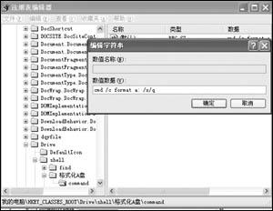 打開注冊表編輯器,如圖2所示,依次展開[HKEY_CLASSES_ROOT/ Drive/shell ]鍵;右鍵單擊“Shell”主值,指向“新建”,再單擊“項”,將新建項命名為“格式化A盤”;右鍵單擊“格式化A盤”項,指向“新建”,再單擊“項”,并將新建項命名為“Command”;在右窗格中,雙擊“默認(rèn)”項,然后在“數(shù)值數(shù)據(jù)”框中鍵入“cmd /c format A: /X/Q”,單擊“確定”按鈕。最后退出注冊表編輯器即可。