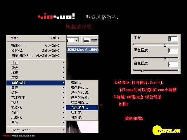 1.打開原圖,按ctrl + l適當(dāng)?shù)恼{(diào)下色階。2.執(zhí)行菜單:濾鏡 > 畫筆描邊 > 深色線條,參數(shù)設(shè)置如下圖右