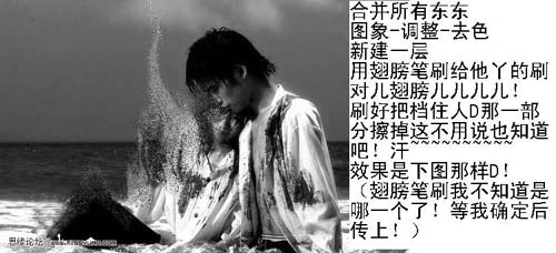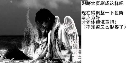 | 6.合并所有圖層,按ctrl + shift + u去色,新建一層用翅膀筆刷給人物刷上翅膀。 |