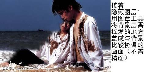 2.接著隱藏圖層1,用圖章工具將背景層需要揮發(fā)的地方蓋成與背景比較協(xié)調(diào)的畫面。