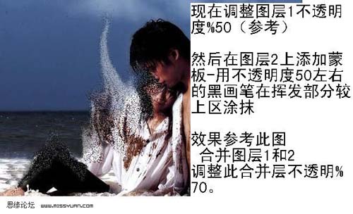 | 5.現(xiàn)在調(diào)整圖層1不透明度為50%,然后在圖層2上加上圖層蒙版,用不透明度為50左右的黑色畫筆在揮發(fā)部分較上區(qū)涂抹。合并圖層1和圖層2調(diào)整此合并圖層不透明度為70% |