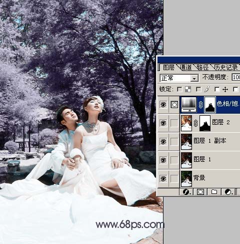 1.打開原圖按ctrl + j復制一層,選擇菜單:圖像 > 模式 > lab模式,選擇不拼合圖層,點通道面板,選擇b通道按ctrl + a全選,按ctrl + c復制,點a通道按ctrl + v粘貼,回到圖層棉版,選擇菜單:圖像 > 模式 > rgb模式,效果如圖1。