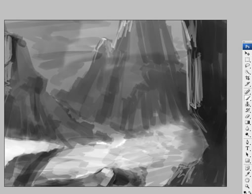 1、將畫筆設置為顏色濃淡隨壓感變化,然后大致的確定出場景的布局。這里我只用黑白2色來進行繪制。