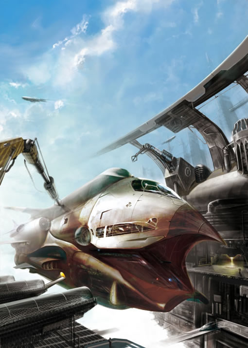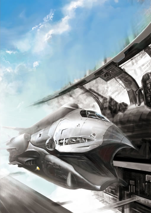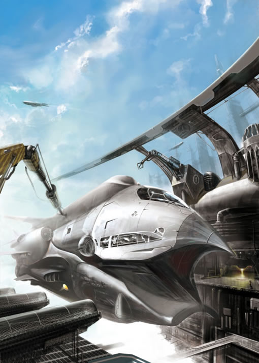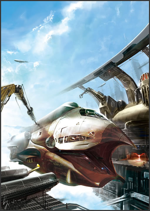 5、這一步就是畫前景了,我在畫面上添加了一個為飛船加油的裝置和幾個登機通道,總之盡能的讓設計合理化。