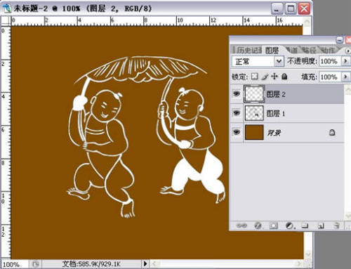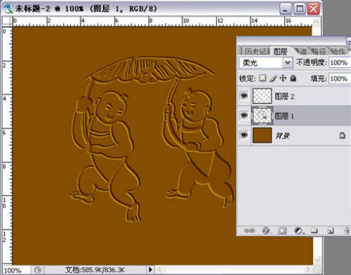 怎么樣?是不是應該稱為“不是浮雕的浮雕”呀?當你把圖層1移得很遠時,會發現圖層1和2分開了,也看不到浮雕效果了,這里我們所看到的浮雕效果,只是視覺差產生的,圖片并沒有真正的浮起來。