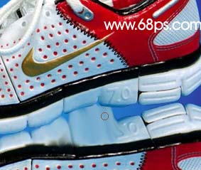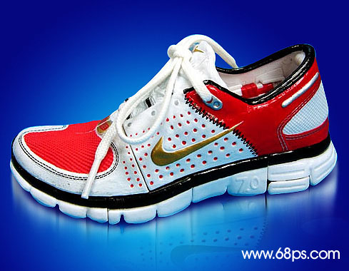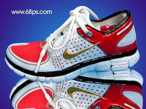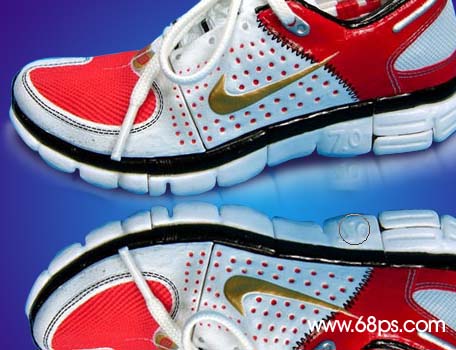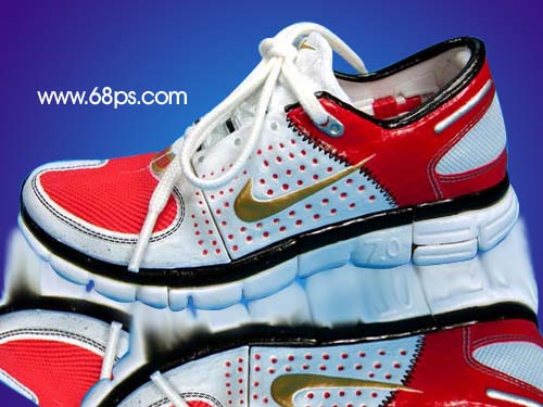 5.擦好以后新建一個圖層(圖層位置在鞋與倒影層之間),用鋼筆工具勾圖7所示的路徑,按ctrl + enter轉為選區按ctrl + shift + d羽化數值為6,填充顏色:#070e5e,大致效果如圖8。這一步是簡單制作鞋子的陰影。