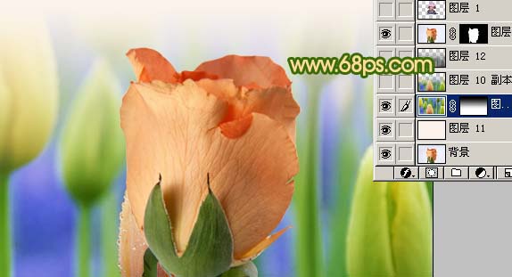 2、在背景圖層上面新建一個(gè)圖層,然后打開圖3所示的素材拖進(jìn)來(為了方便素材是才建好的剛好跟畫布一樣大),執(zhí)行:濾鏡 > 模糊 > 高斯模糊,數(shù)值為8,然后加上圖層蒙版,選擇黑白漸變,有下往下拉出漸變,圖層及效果如圖4。