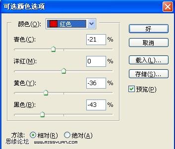 6、創建可選顏色調整圖層,分別對紅色和黃色調整,參數設置如下圖。