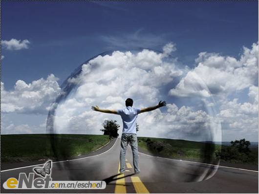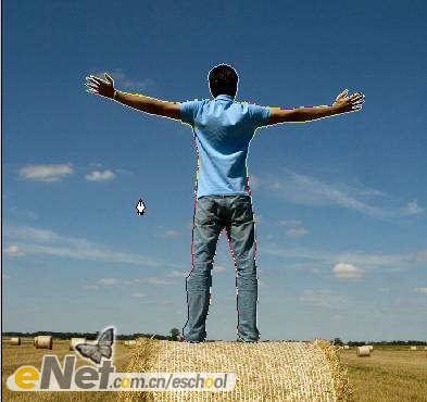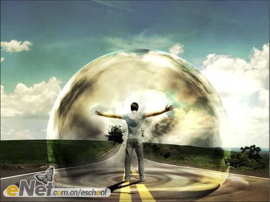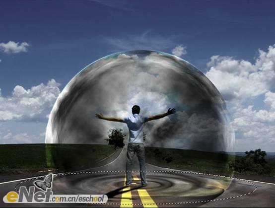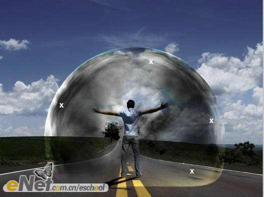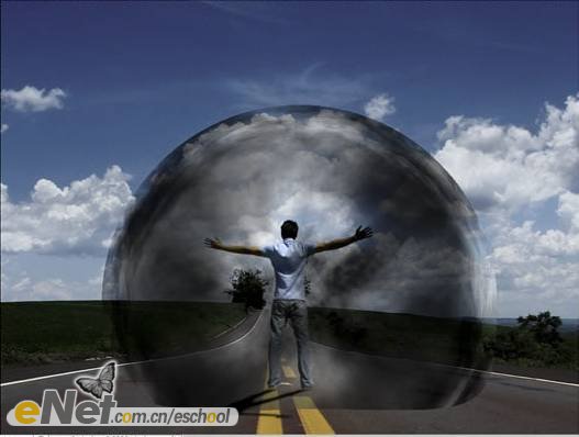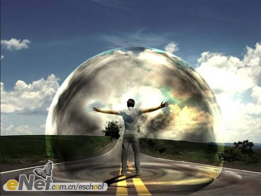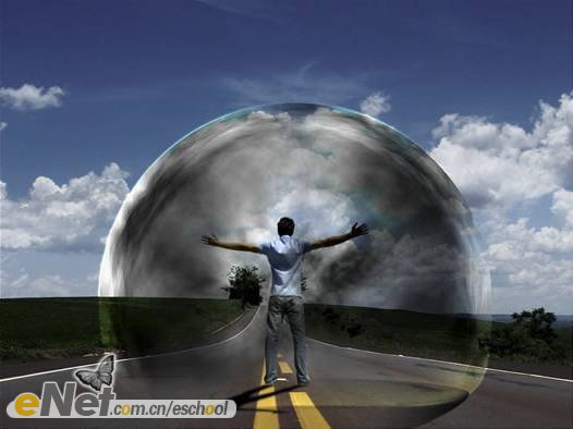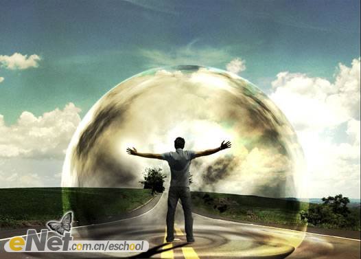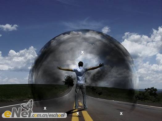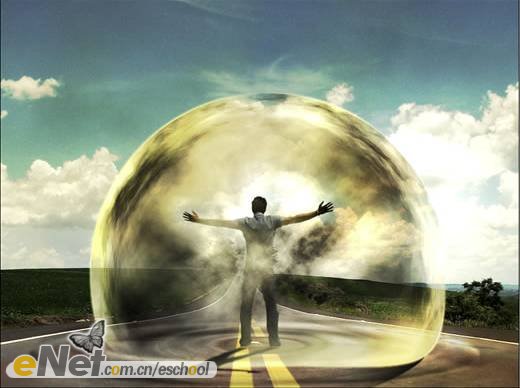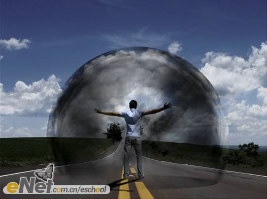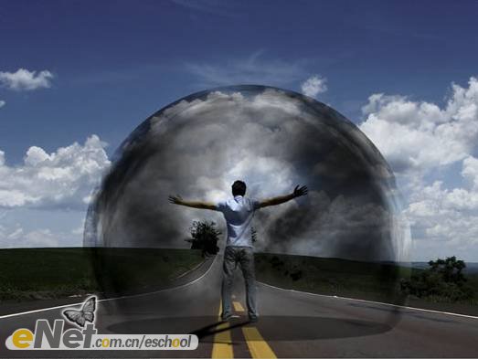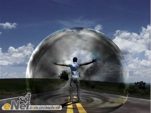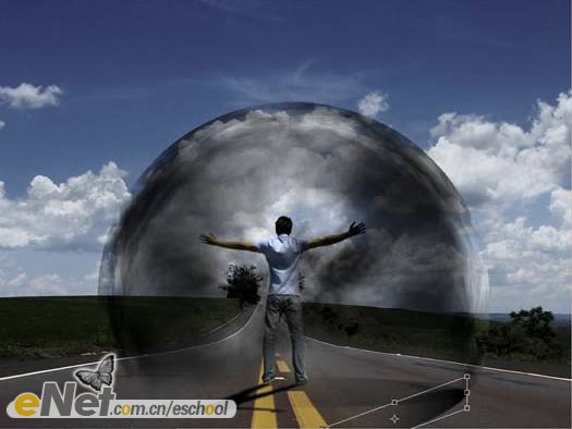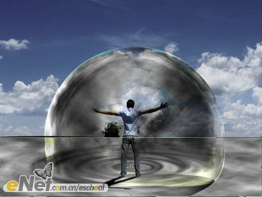 第二十三步:下面讓我們來做一些調(diào)整。首先,讓我們把“超人”變暗一些。在工具箱中選擇【加深工具】,激活圖層【人】,在人物的背面涂抹。然后將圖層【波紋2】的圖層混合模式改為【柔光】。當(dāng)然你還可以刪除掉【云3】圖層的部分圖像。效果如下圖所示。