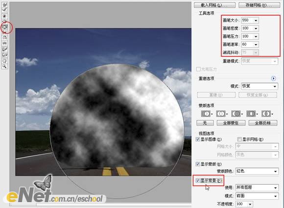 勾選【顯示背景】選項(xiàng),這樣你就可以看清“云”和背景了,如上圖所示。使用【膨脹工具】在“云”上點(diǎn)擊多次,直到得到滿意的效果。取消勾選【顯示背景】后,效果應(yīng)如下圖所示。