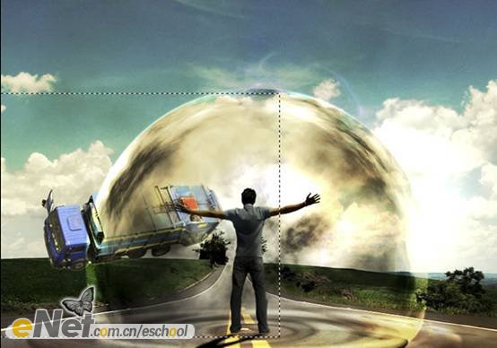 使用【矩形選框工具】繪制一個(gè)比卡車稍大一點(diǎn)的矩形選區(qū),如下圖所示。