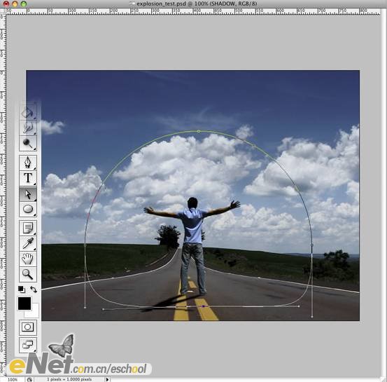 第二步:打開【素材2】,將其拖入【沖擊波】中,將圖層命名為【人】。使用【鋼筆工具】將人物的輪廓勾出來,如下圖所示。