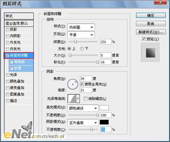 執(zhí)行【圖層—圖層樣式—斜面和浮雕】命令,參數(shù)設(shè)置及效果如下2圖所示。