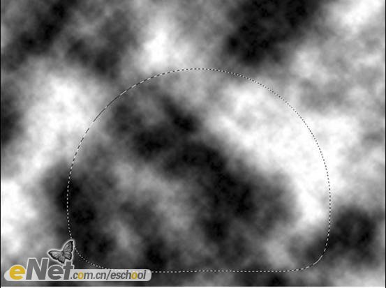 第七步:新建一層,將其重命名為【云】。執(zhí)行【濾鏡—渲染—云彩】命令,進(jìn)入路徑調(diào)板,按住【ctrl】鍵不放,點(diǎn)擊【工作路徑】的縮略圖,載入選區(qū),如下圖所示。