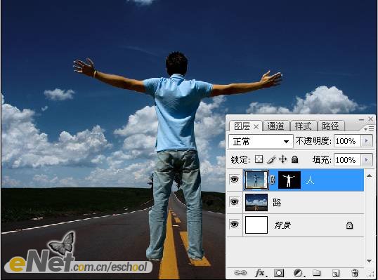 進(jìn)入路徑調(diào)板,點(diǎn)擊【將路徑作為選區(qū)載入】按鈕,載入選區(qū)。然后執(zhí)行【圖層—圖層蒙版—顯示全部】命令,為圖層添加蒙版,效果如下圖所示。