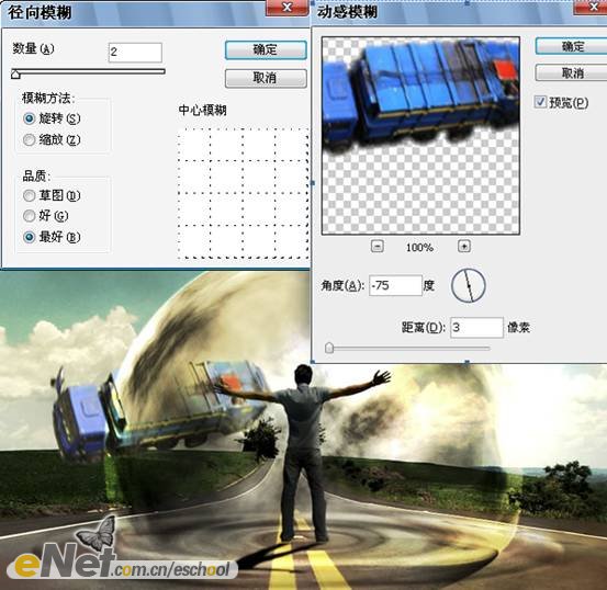 然后執(zhí)行【濾鏡—模糊—徑向模糊】命令;再執(zhí)行【濾鏡—模糊—動(dòng)感模糊】命令,參數(shù)設(shè)置及效果如下圖所示。
