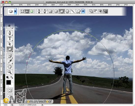 第六步:選擇【橢圓工具】,在選項(xiàng)欄中選擇路徑方式,繪制如下圖所示的正圓選區(qū)。