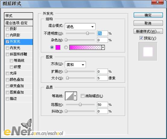 執(zhí)行【圖層—圖層樣式—外發(fā)光】命令,使用默認(rèn)設(shè)置就可以了。然后執(zhí)行【圖層—圖層樣式—創(chuàng)建圖層】命令。這個(gè)命令將創(chuàng)建一個(gè)“外發(fā)光”的新層(我們將這個(gè)圖層重命名為【外發(fā)光】),你可以將填充為白色的那個(gè)圖層刪掉了。效果如下圖所示。