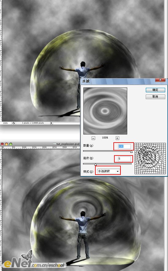 第十七步:在圖層【路】上面新建一層【波紋】,對新圖層執(zhí)行【濾鏡—渲染—云彩】命令。然后再執(zhí)行【濾鏡—扭曲—水波】命令,參數(shù)設(shè)置參考下圖。