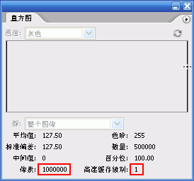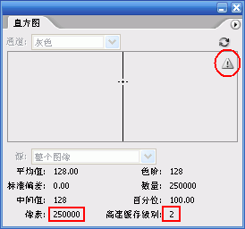 這時看一下直方圖面板,會發(fā)現(xiàn)右上角多了一個警告圖標(biāo)。這是緩存級別2的圖片。通過直方圖我們可以看出緩存級別2是張純灰色的圖片,灰度值128,像素數(shù)量250000,正好是原圖的1/4。
