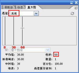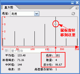 色階、數(shù)量、百分位這三項(xiàng)根據(jù)鼠標(biāo)指針的位置來顯示橫坐標(biāo)當(dāng)前位置的統(tǒng)計數(shù)據(jù)。