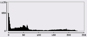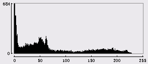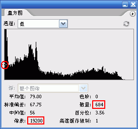 這幅圖像的像素總數(shù)為19200。當(dāng)鼠標(biāo)光標(biāo)移到直方圖最左邊(色階為0)時,顯示出數(shù)量的最大值684,這個最大值應(yīng)該就是最長的一條豎線。當(dāng)鼠標(biāo)向右移動到色階2時,數(shù)量為526,但豎線仍是同樣長度,這說明色階0的豎線被photoshop裁去了一部分。那么photoshop是如何確定該裁去多少呢?