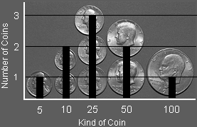 把統(tǒng)計的結(jié)果圖示出來,就成了直方圖。下圖的橫向數(shù)軸標(biāo)示出硬幣的面額(kind of coins),縱向標(biāo)示出硬幣的數(shù)量(number of coins)。