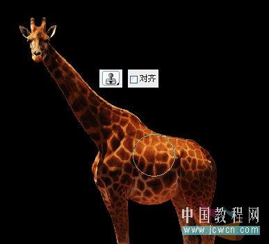 八、選擇仿制圖章工具,切換到長頸鹿素材文件中,按alt鍵在鹿身體部分取仿制源,記得要把對齊勾選去掉哦