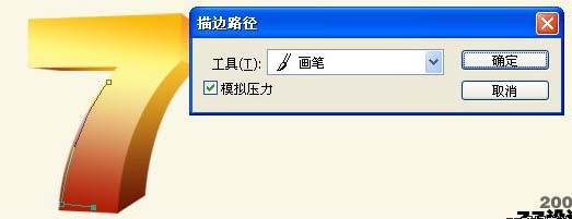 3、立體效果已經(jīng)初步完成,那么是否感覺這樣的效果缺少一定的光澤感,沒錯,接下來我們就要對“7”做反光處理,首先應(yīng)找準(zhǔn)反光點(diǎn),接下來又是考驗(yàn)鋼筆運(yùn)用的時刻了。 先點(diǎn)擊畫筆,選擇好我們需要的反光線條的寬度,這邊我先選擇直徑為4的柔角畫筆。 然后點(diǎn)擊鋼筆,用鋼筆勾好路徑。 |