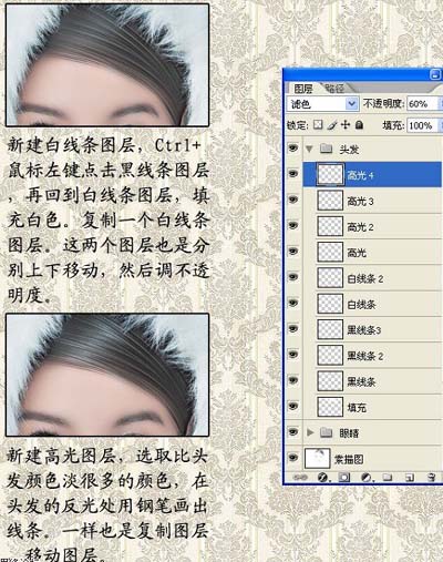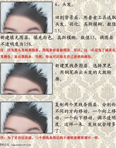 6、頭發(fā)部分的處理,主要是高光及暗調(diào)頭發(fā)的制作,這一步操作比較復(fù)制,注意好多建圖層。 |