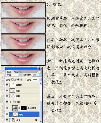 5、嘴巴部分的細(xì)節(jié)處理,主要是修飾高光和暗調(diào)。 |