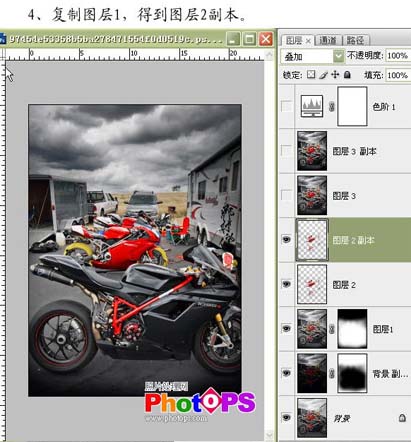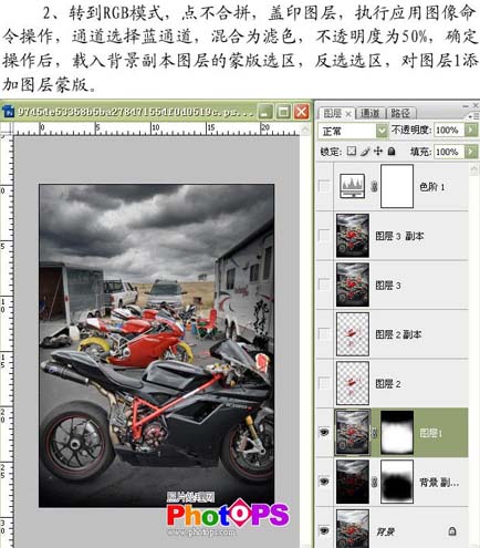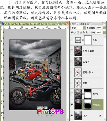 1、打開原圖素材,選擇菜單:圖像 > 模式 > lab顏色,按ctrl + j把背景復制一層,點通道面板,選擇明度通道,執行:圖像 < 應用圖像操作,模式:正片疊底,其它選項默認,確定后,再重復操作一次,回到圖層面板,加上圖層蒙版,用黑色畫筆涂抹摩托車四周。 |