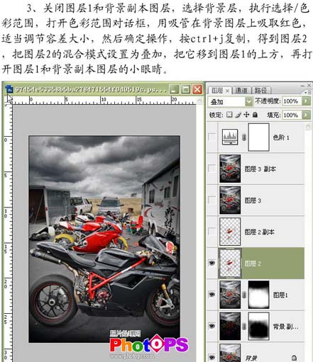 3、關閉圖層1和背景副本圖層,選擇背景層,執行:選擇 > 色彩范圍,打開色彩范圍對話框,用吸管在背景層上吸取紅色,適當調節容差大小,然后確定操作,按 ctrl + j復制,得到圖層2,把圖層2的混合模式改為“疊加”,把它移到圖層1的上方,再打開圖層1和背景副本圖層的小眼睛。 |