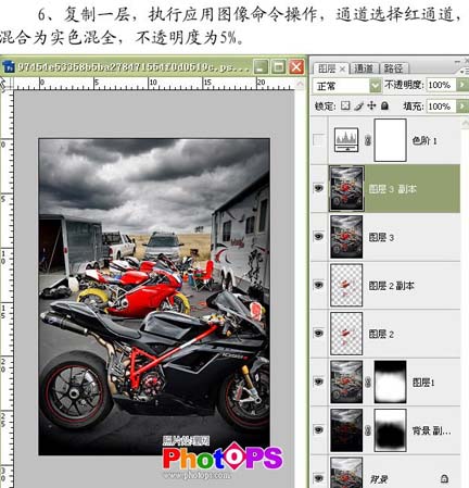 6、復制一層,執行:圖像 > 應用圖像操作,通道:紅色,混合:實色混合,不透明度:5%。 |