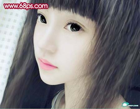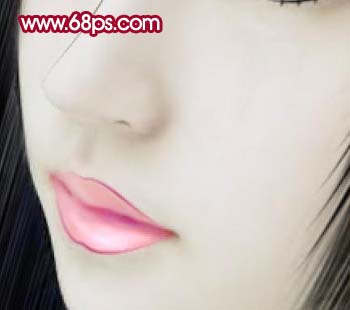 8、用暴光度為8%,直徑為8的減淡工具把嘴唇部分涂出高光,再用中間調(diào),暴光度50%的加深工具,把唇邊鼻子邊邊加深。 |