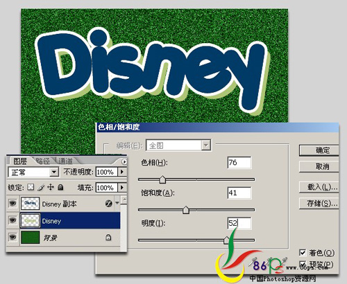 5、選擇在下面的文字層,ctrl+下、右箭頭各8次,將下面的文字移動出少許來,并ctrl+u調整這層的色相/飽和度,勾選‘著色’。