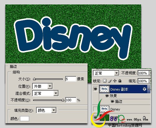 4、給在上面的文字設置圖層樣式:描邊,顏色用白色。